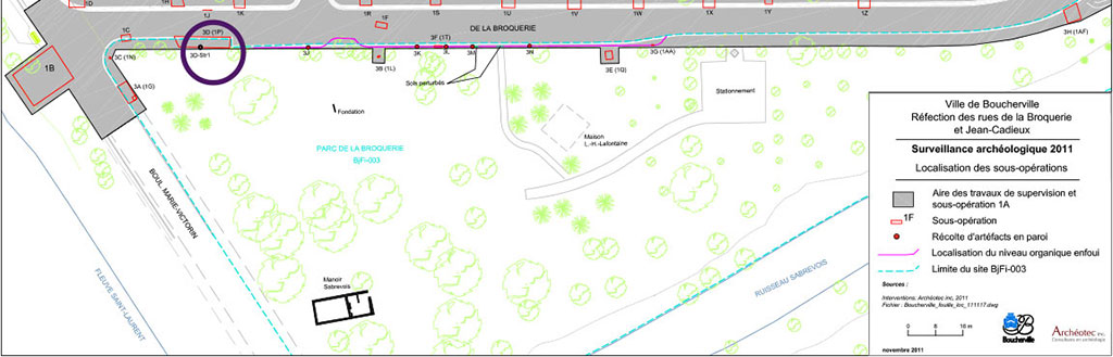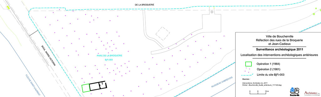 En 2011, la Ville de Boucherville effectue des travaux de réfection d’aqueduc et de conduites sanitaires sur la rue De La Broquerie. C’est dans ce contexte qu’en 2011 une surveillance archéologique est effectuée par la firme Archéotec. Ces travaux sont effectués en bordure du Parc historique La Broquerie et aux limites de ce dernier.