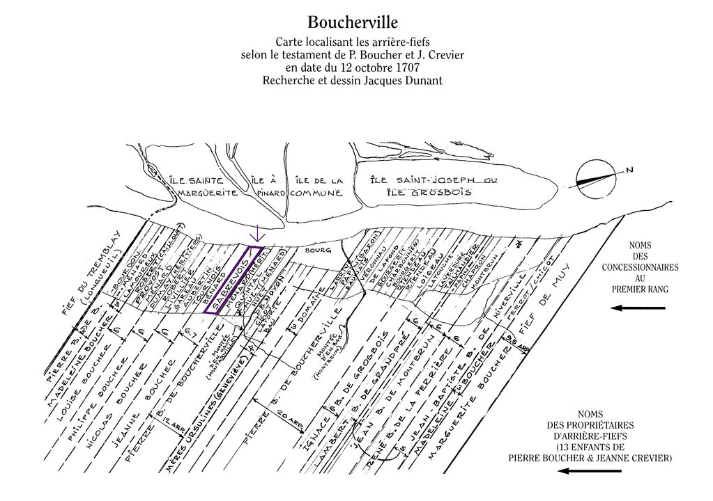 Le testament de Pierre Boucher et Jeanne Crevier, notarié par Ant. Adhémar en 1707, indique que les cofondateurs de Boucherville accordent à leurs enfants un arrière-fief de six arpents sur deux lieues de profondeur. Trois de leurs enfants reçoivent des terres de grandeurs différentes. Pour sa part, Jeanne de Sabrevois obtient six arpents, lesquels sont composés de quatre arpents du Sieur Sabrevois en arrière-fief ainsi que deux arpents et huit perches tenus par Joseph Bénard dit Carignan.