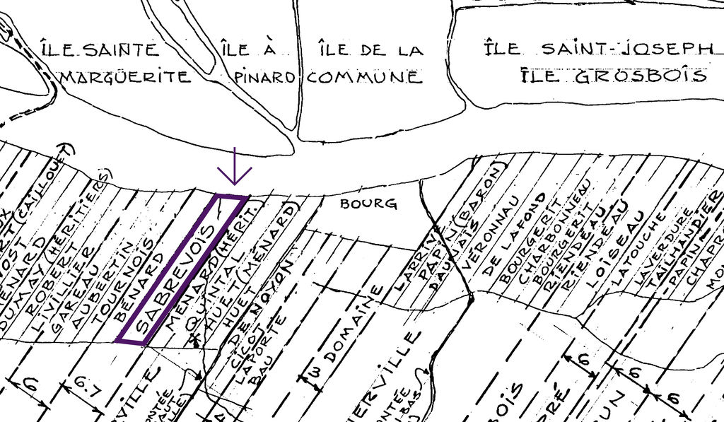Jacques-Charles Sabrevois, époux de Jeanne Boucher, fille de Pierre Boucher et Jeanne Crevier, achète des sieurs Jean Vinet et de la veuve de Jean Haudecoeur deux terres situées l’une à côté de l’autre. En bordure du fleuve Saint-Laurent, ces terres mesurent environ chacune deux arpents de large sur vingt-cinq de profondeur.